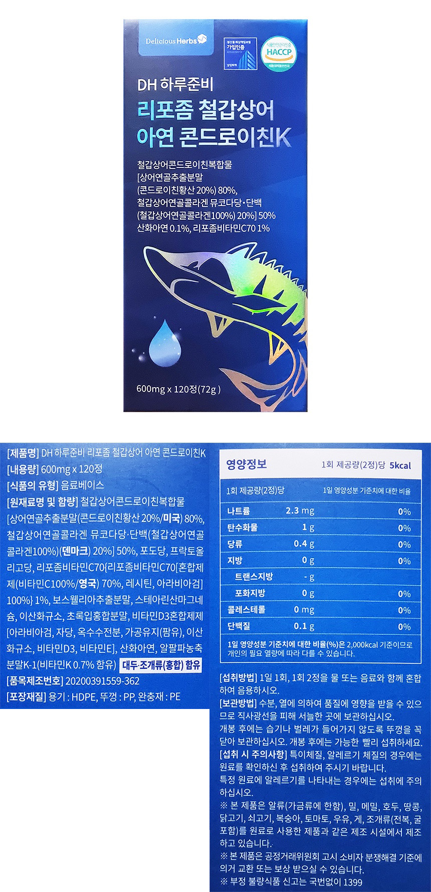 [맛있는허브] DH 하루준비 리포좀 철갑상어 아연 콘드로이친K 600mg*120정